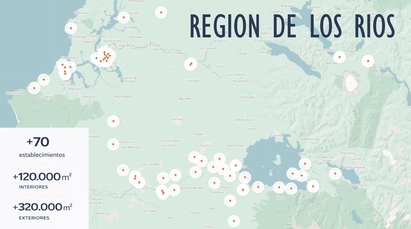 Región de Los RíosEl levantamiento consideró más de 70 establecimientos educacionales, abarcando una superficie superior a 120.000 m² interiores y 320.000 m² de áreas exteriores, mediante trabajo ejecutado directamente en terreno.